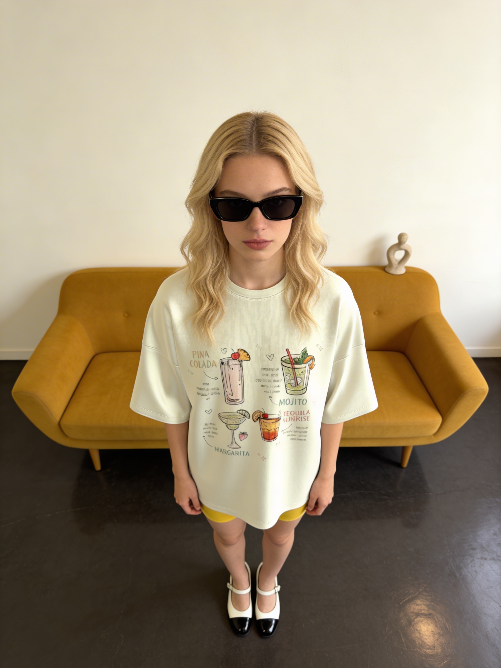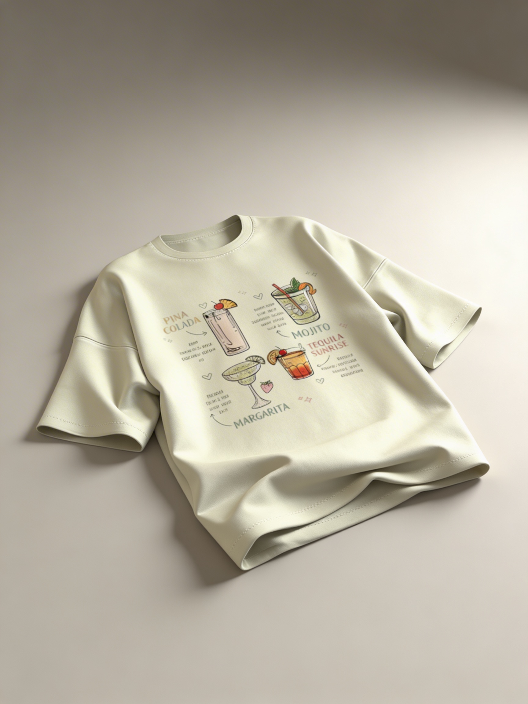 Featuring a vibrant DTF print of classic cocktails like Piña Colada, Mojito, and Margarita, it brings a playful, vacation ready energy to your everyday style. Every detail feels like a sip of summer.
