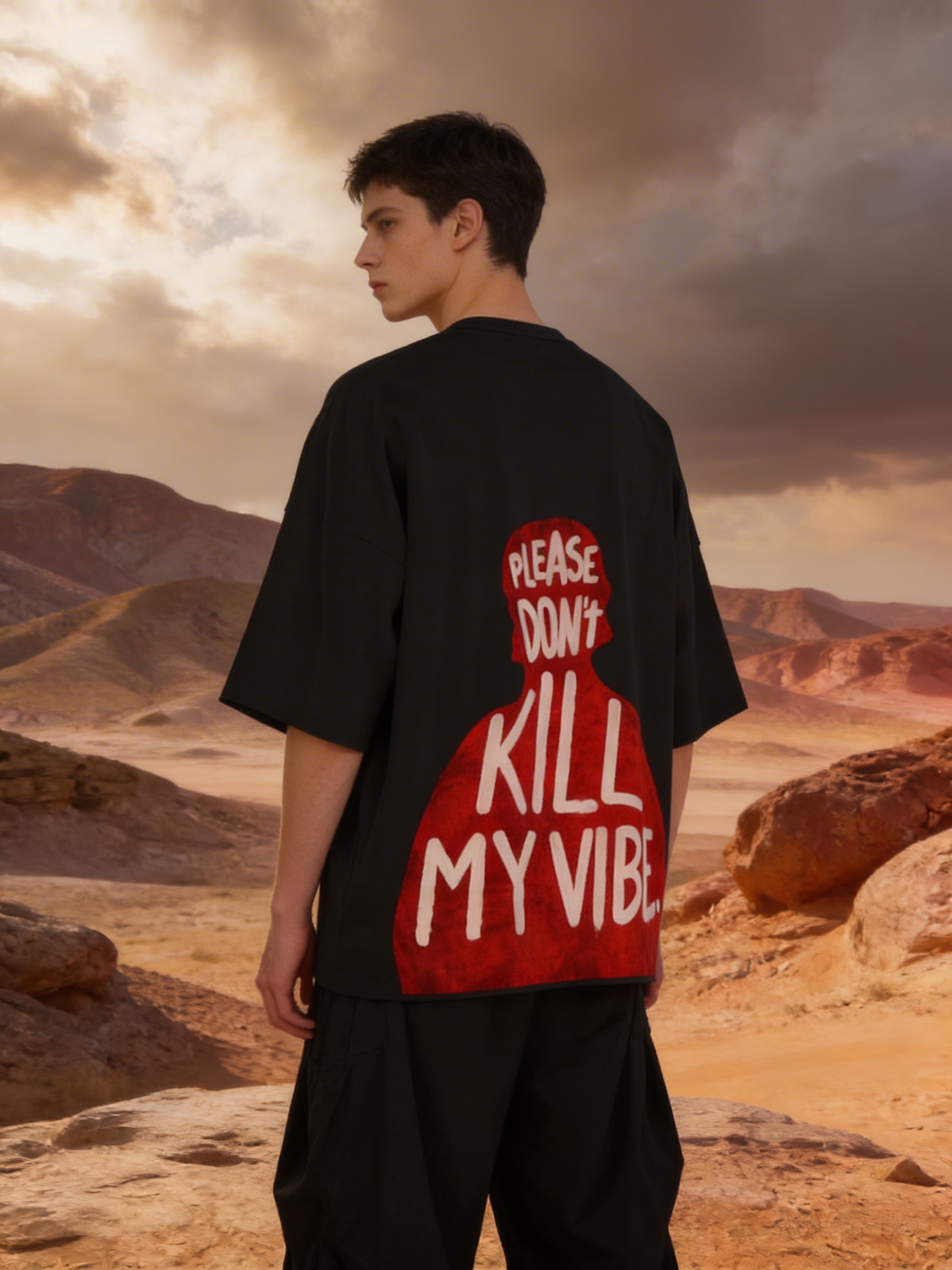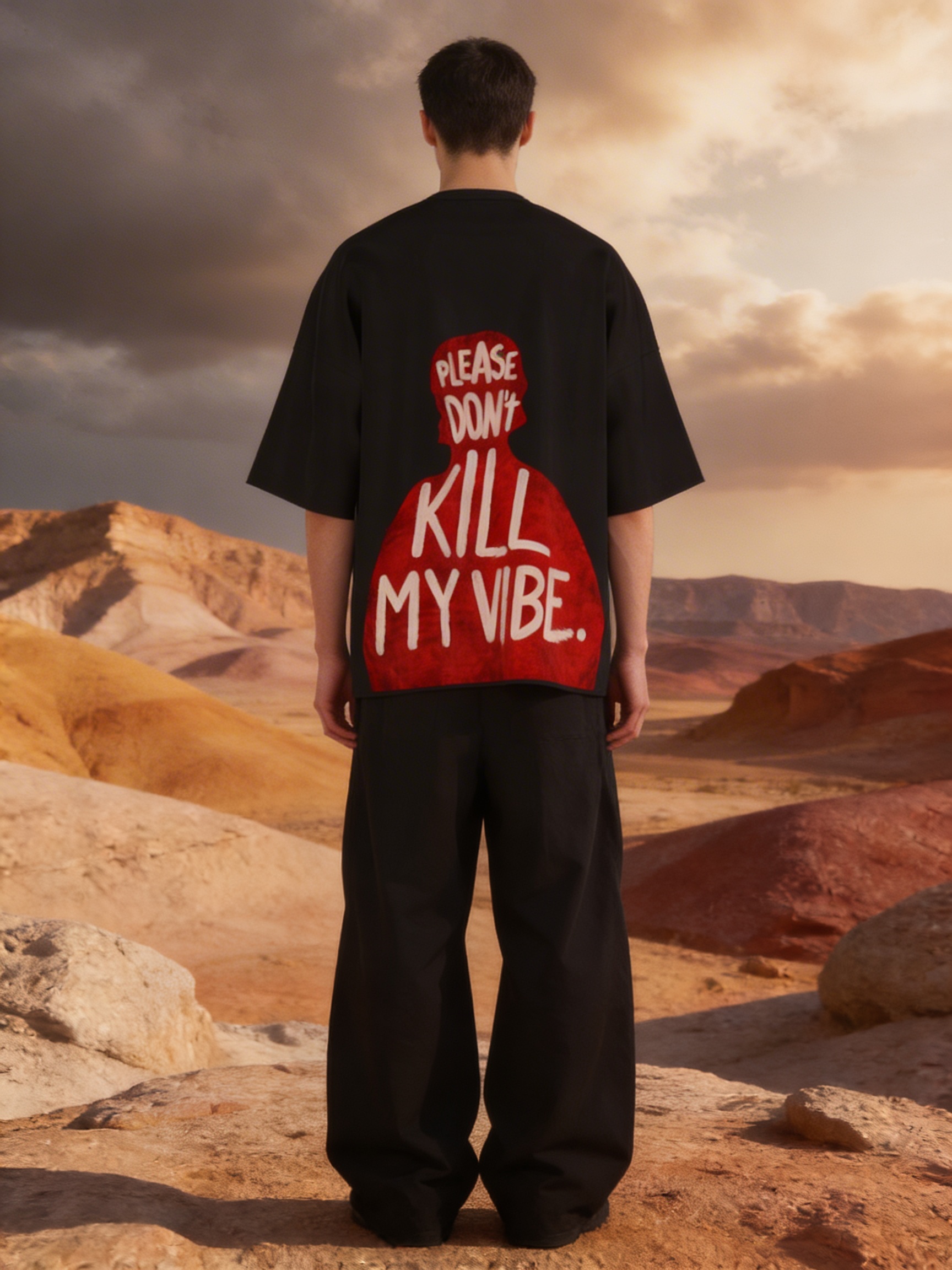Front: AURA - you step in, and the energy follows. Flip it over and it gets personal: PLEASE DON'T KILL MY VIBE, A soft warning, a clear boundary. Designed in an effortless oversized fit for those who know their worth.